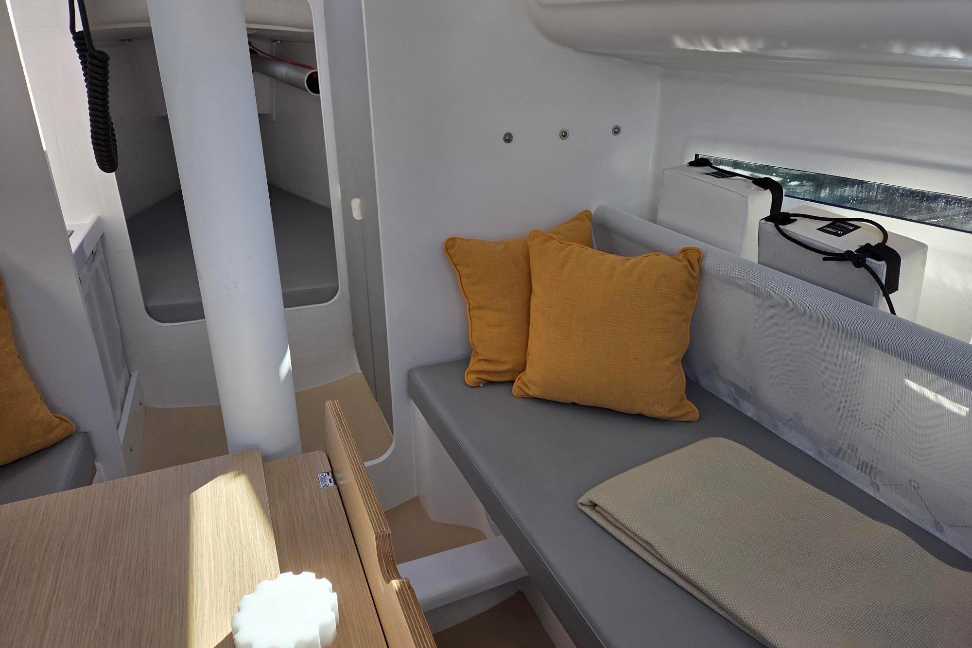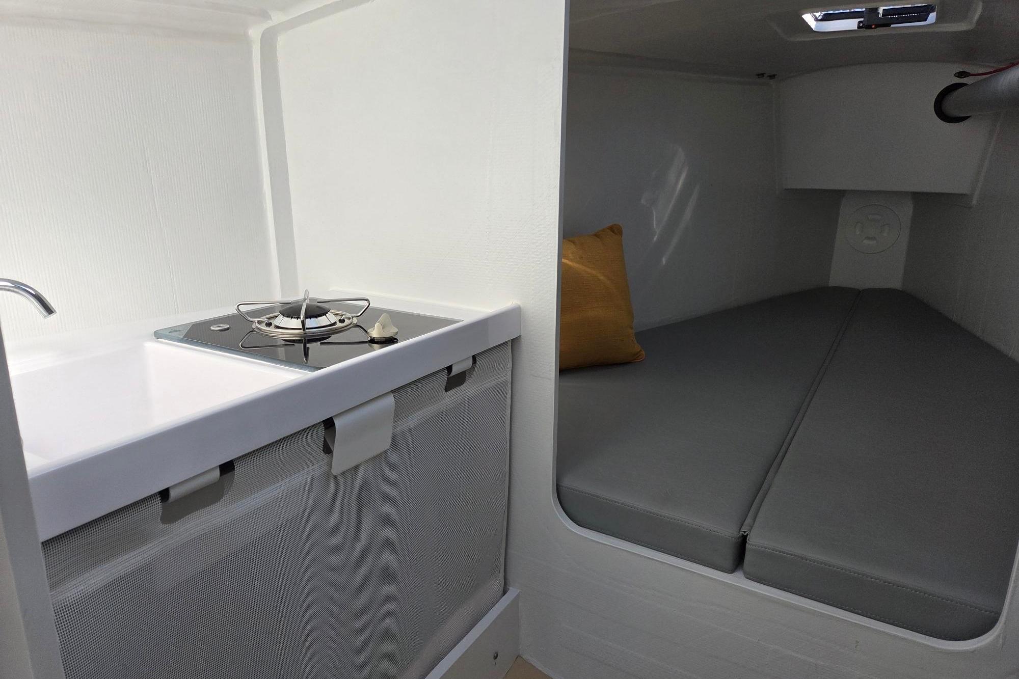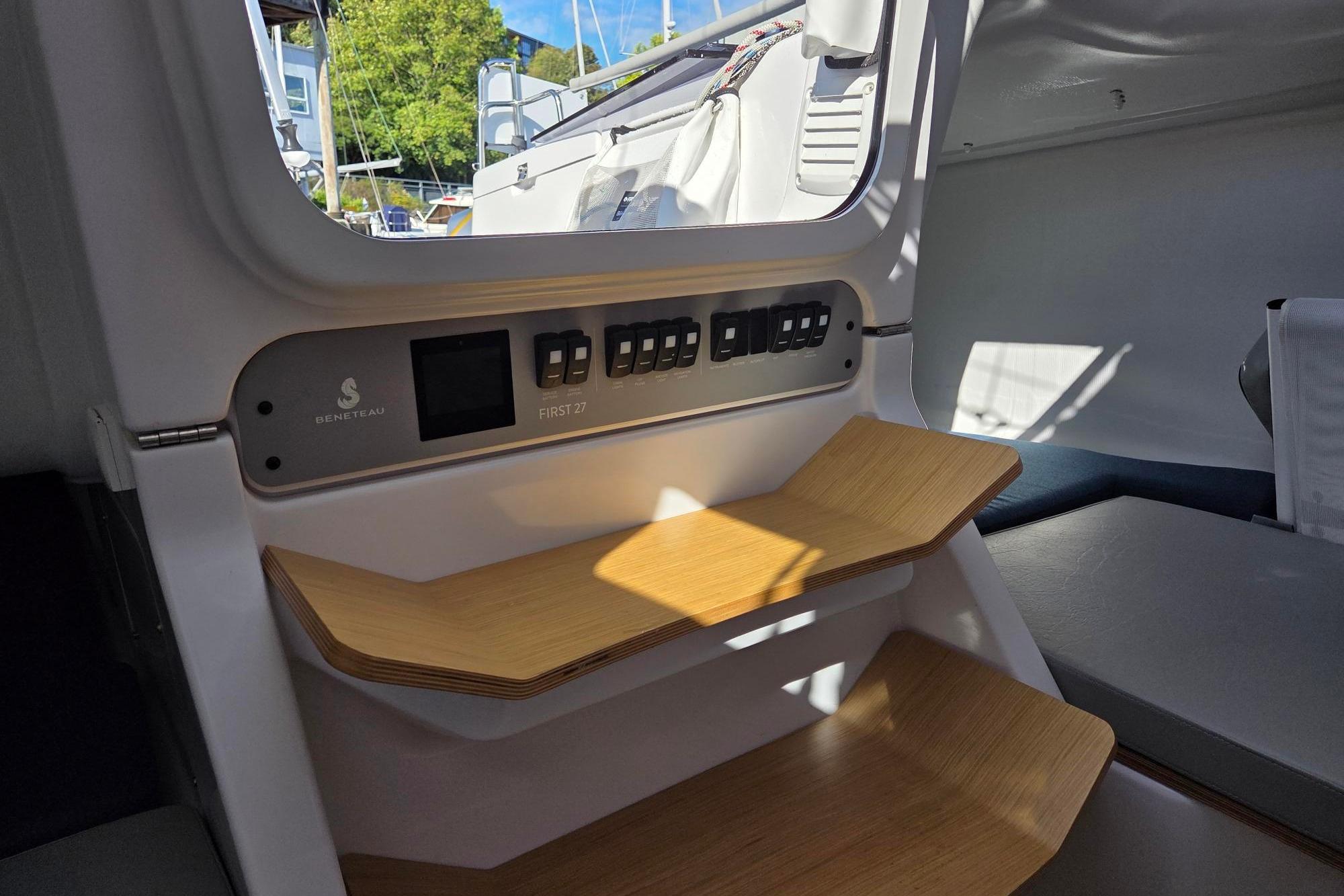 The First 27 was crafted by naval architect Sam Manuard specifically for offshore racing, drawing on his personal racing expertise. Its design includes a hard chine extending to the stem, vertical sides, a broad waterline beam, and twin rudders—all hallmarks of a rugged, competitive vessel. The hull shape, carbon rig, and deep draft lead keel work together to deliver exceptional stability. Notably, the keel accounts for half of the boat’s total weight, contributing to impressive power and performance. The cockpit is both spacious and comfortable, featuring two full-length foot chocks. Additionally, a manually operated hydraulic jack for keel lifting makes the First 27 easy to tow.