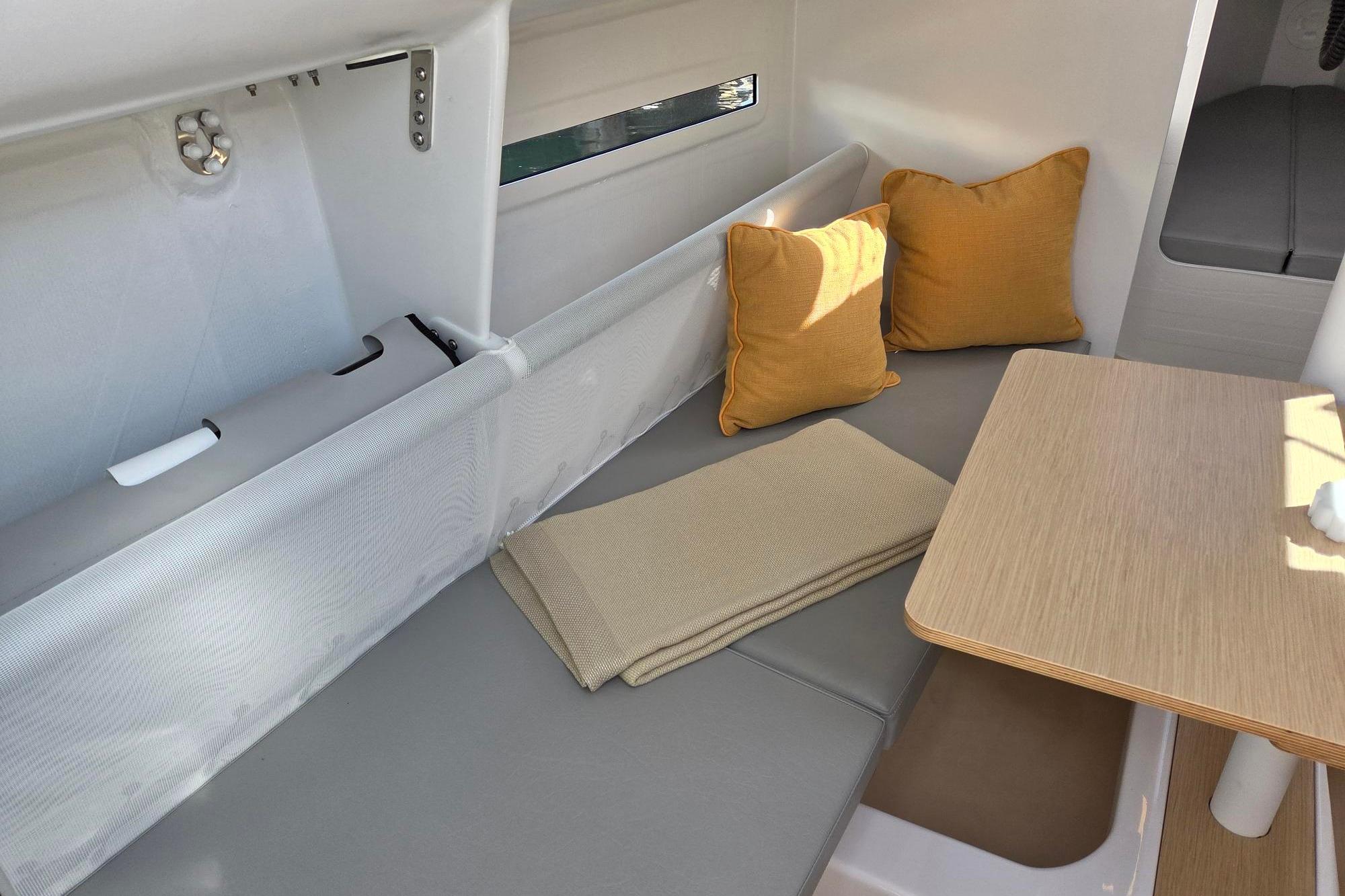 Alum mast, deep fixed keel, cockpit benches, coachroof winches, comfort pack: grey pvc upholstery, folding wooden table, 2 folding magnetic doors