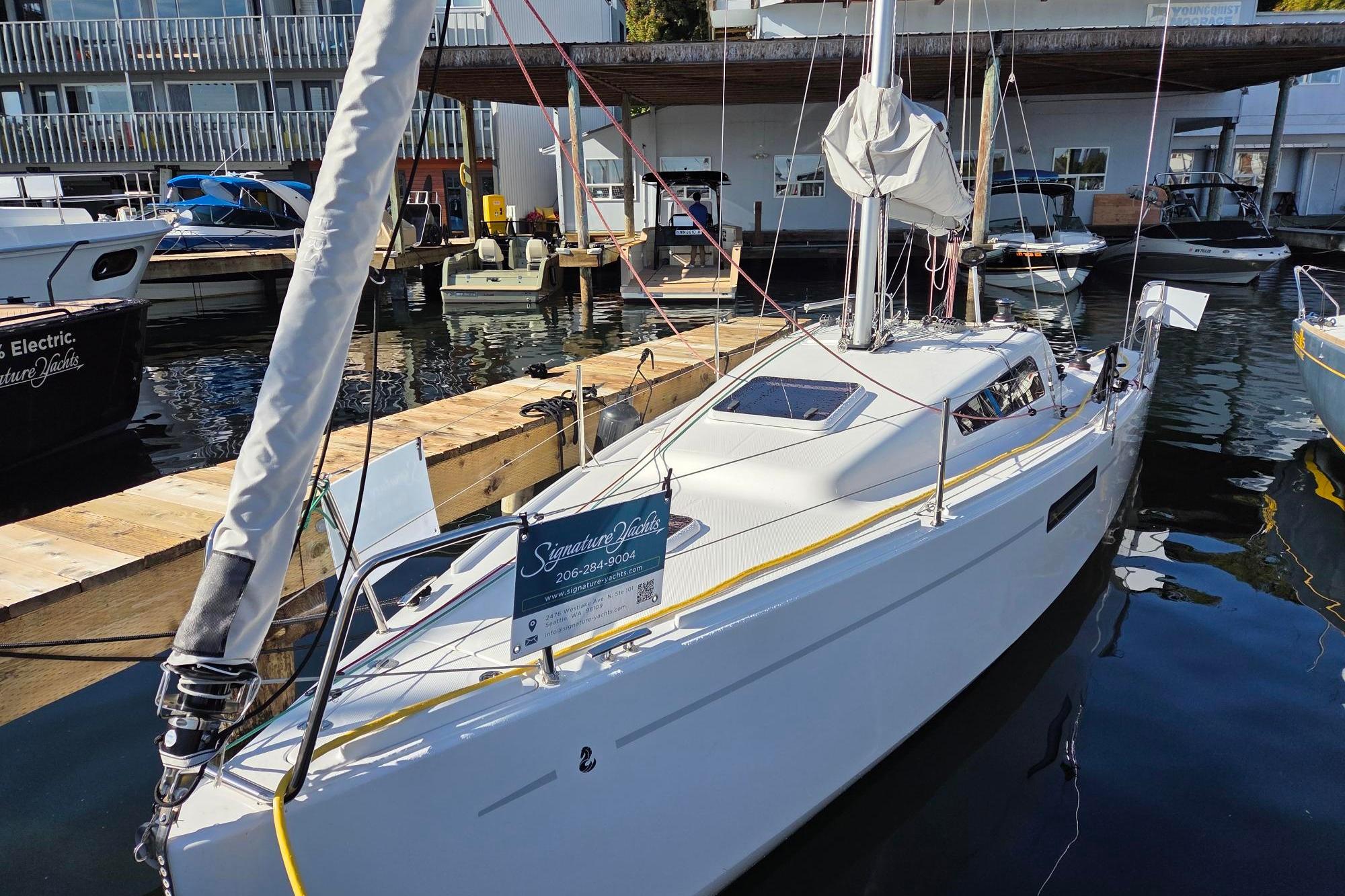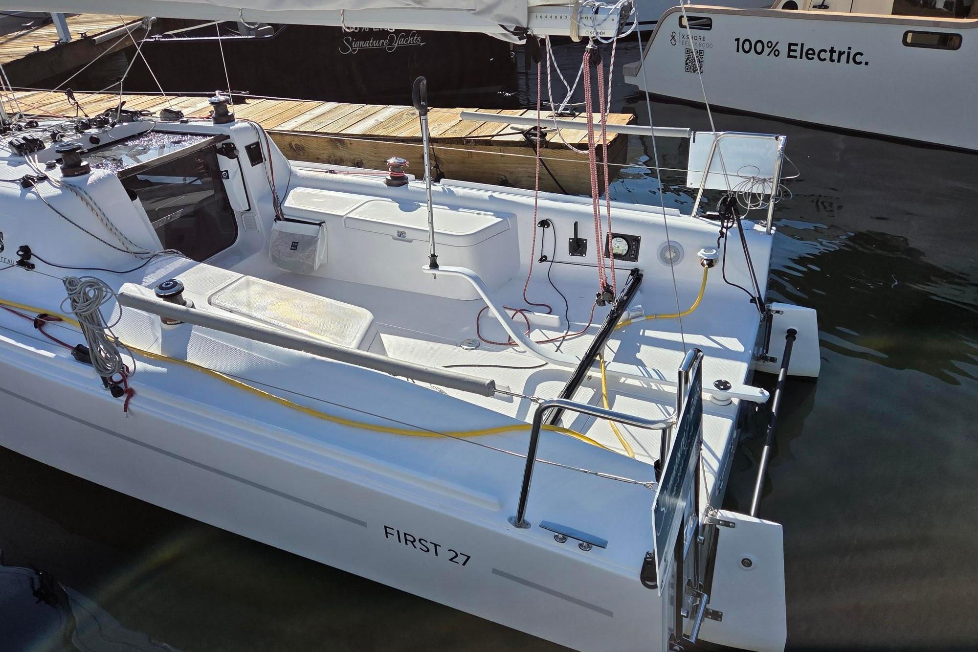 The First 27 was designed for offshore racing by naval architect Sam Manuard, taking inspiration from his own racing experience. Featuring a hard chine as far as the stem, vertical sides, a good beam on the waterline and twin rudders, she has all the makings of a robust competitive boat. Her hull shape, carbon rig, and deep draught lead keel, combine to make here remarkably stable. With her keel taking up 50% of her weight, she is an incredibly powerful yacht. The cockpit is spacious and comfortable, and has two foot chocks over the full length. With a manually operated hydraulic jack to lift the keel, the First 27 is easy to tow.